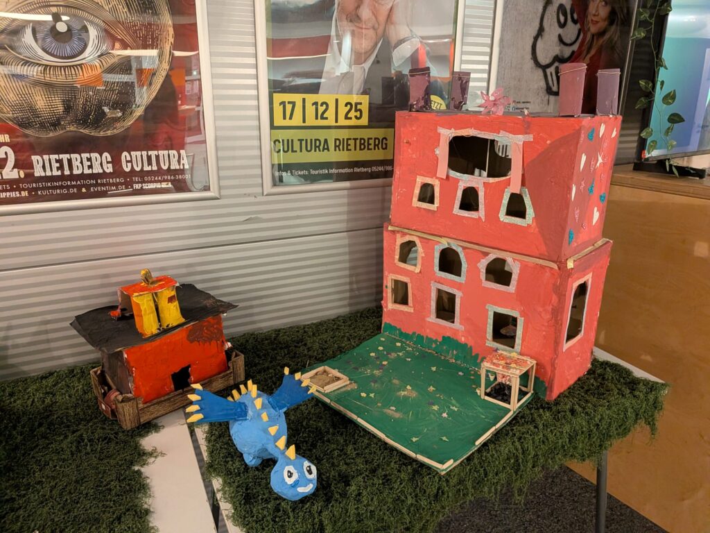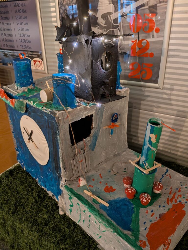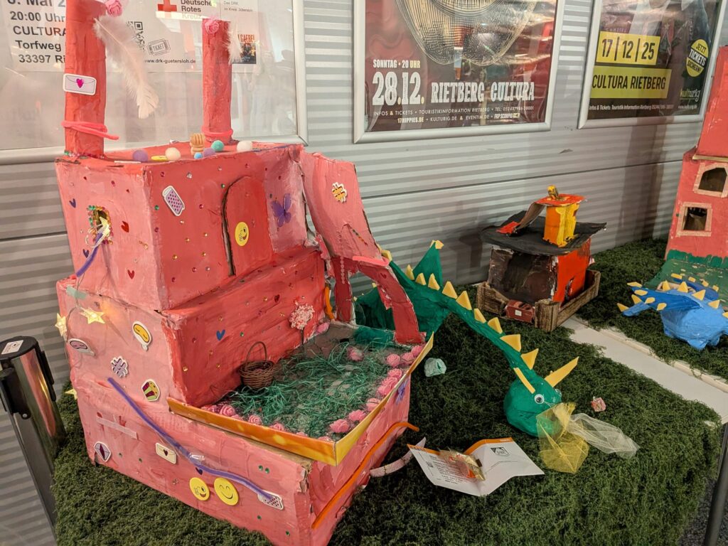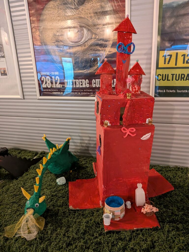 Die Kinder der Klassen 3a und 3b haben im Kunstunterricht in Gruppenarbeit Märchenschlösser und Drachen gebaut. Die Kunstwerke wurden vom 29.11. bis zum 14.12.2025 im Foyer der Culture während des Musicals „Shrek“ ausgestellt.