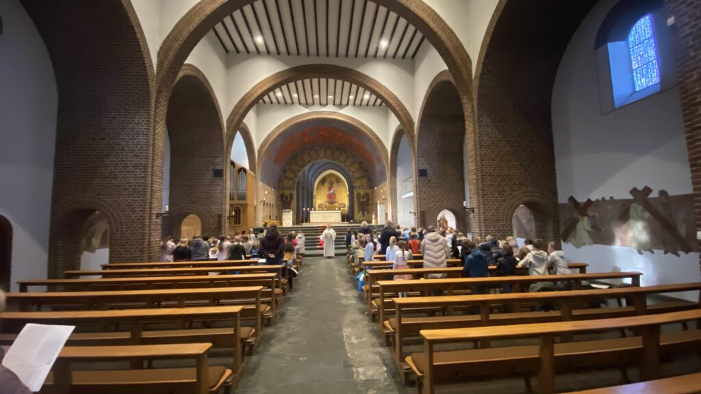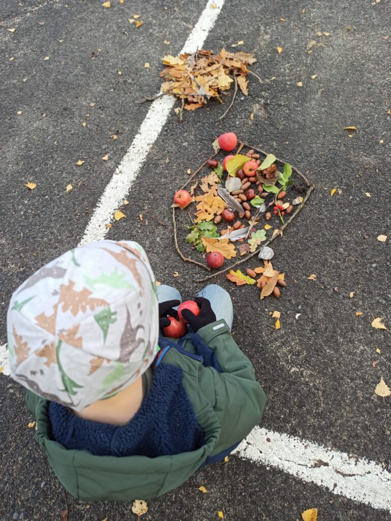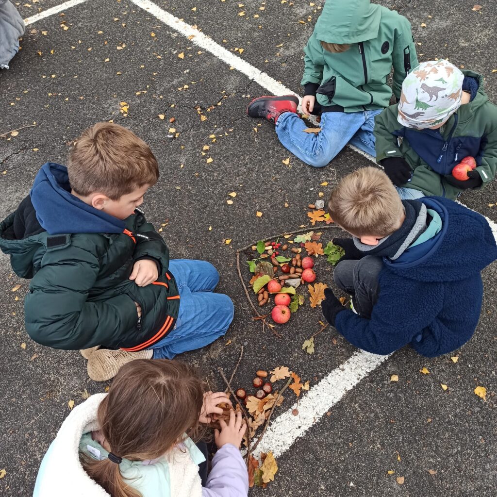 Die Klasse 1 gestaltet Herbstmandalas auf dem Schulhof und der Standort besuch den Gottesdienst zu Sankt Martin in der Kirche.